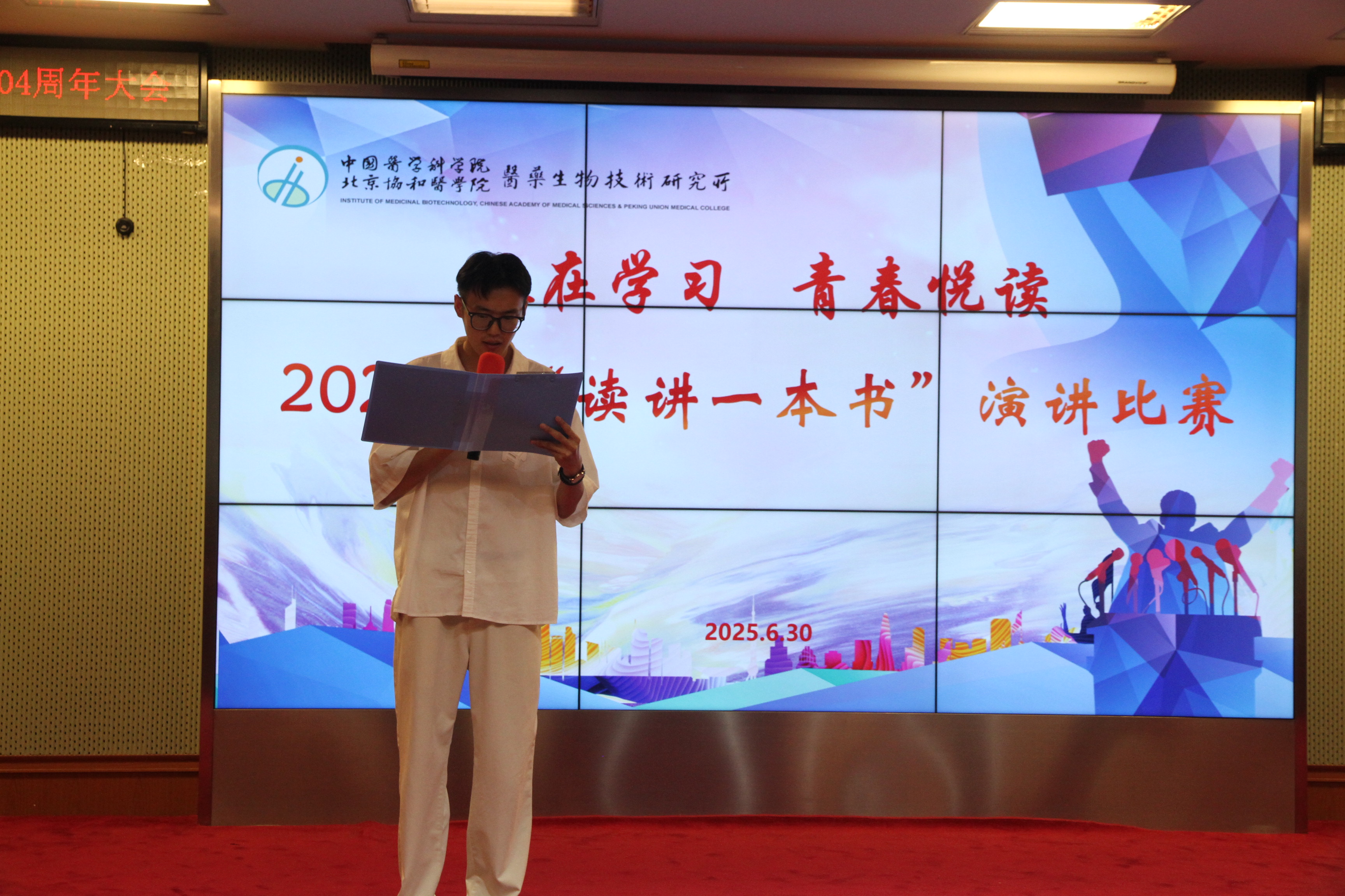 为庆祝中国共产党成立104周年,深入学习贯彻习近平新时代中国特色社会主义思想,坚持学思践悟、以讲促学,营造爱读书、读好书、善读书的浓厚氛围。6月30日,药生所举办“政在学习 青春悦读”2025年“读讲一本书”演讲比赛。领导班子成员、党委委员、纪委委员、中层干部、支部委员、职工和学生代表等参加。比赛由党办袁有君同志主持。