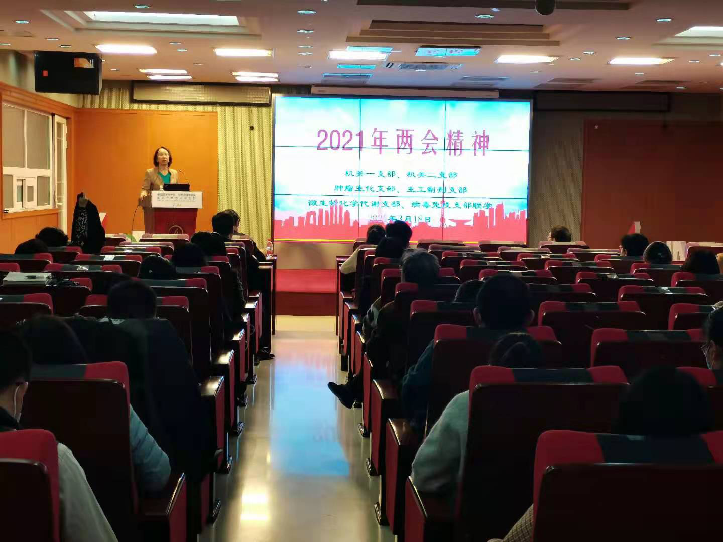 为深入学习贯彻全国两会精神,3月18日,药生所机关一支部、机关二支部、肿瘤-生化支部、生工-制剂支部、微生物化学-代谢支部、病毒-免疫支部联合开展了“学习两会精神,强化科技创新”主题党日活动,研究所老领导、全国政协委员蒋建东教授受邀作专题报告。相关支部党员、入党积极分子、青年职工学生80余人参会,贾淑英书记受邀主持会议。