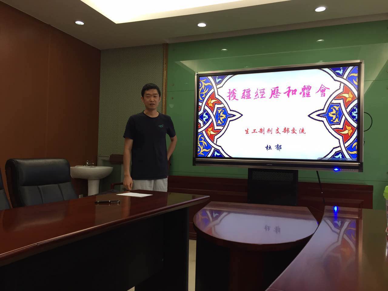最后,杜郁同志围绕一年的援疆经历和体会向支部同志做了专题报告,包括:援疆背景及意义、援疆工作内容、援疆带给自己的感悟和思考等。杜郁同志向大家阐述了新时期尤其是在“一带一路”背景下,新疆在中华民族伟大复兴历史进程中的重要地位、中央治疆方略以及援疆工作的历史必然性;介绍了新疆药物所在新疆药物研发中扮演的关键角色,特别是在援疆工作开展之后所取得的成绩。杜郁同志以援疆干部的视角,展现了在新疆的所见所闻、所为所思,反映了共产党员的使命感和责任心。通过他的介绍,支部党员清晰地认识到了全国对口支援新疆在维护新疆社会稳定和长治久安、促进新疆与内地交流交往、增进各民族团结融合中所承担的历史使命。此次报告作为支部“两学一做”学习教育常态化制度化的一个步骤,引导支部党员立足各自岗位、敢于担当、勇于实干、时时处处不忘共产党员所肩负的使命和责任。