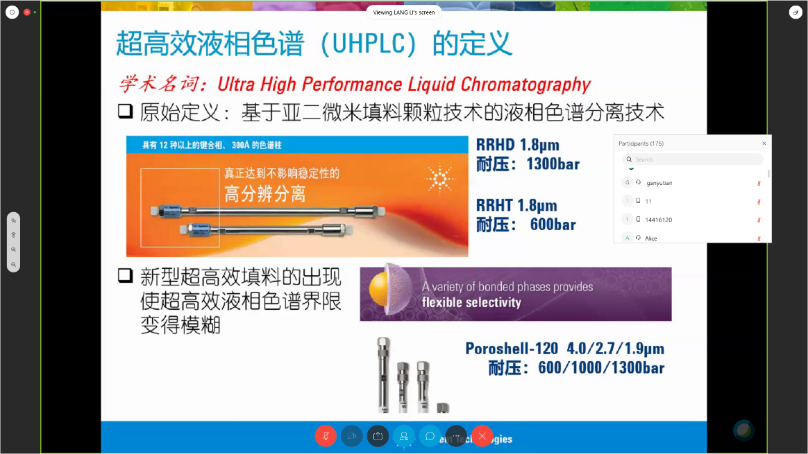 本次技术讲堂采用线上授课模式,是为响应政府号召,积极应对疫情采取的特别教学手段,是现代技术培训与课堂教学深度融合的改革需要,是在师生共同努力下实现的。课程共分8个板块,内容涉及色谱分析方法开发、质谱技术解析应用及代谢组学研究全流程分析等多个领域。从药物分析常用设备基本原理到最新的应用前沿,各协办单位施展所长,聘请最资深的技术专家在线进行授课,参与人数近200人,互动效果良好,相隔遥远却仿佛近在眼前,同学们求知若渴的热情和老师们授业解惑的认真态度完美融合。