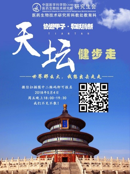 2018年5月4日,为了纪念“五四青年运动99周年”,激发学生积极创新,探索科学的爱国主义热情;同时,也为了进一步丰富学生的课余生活,培养团队合作精神,药生所研究生会如期举行了天坛公园健步走活动。