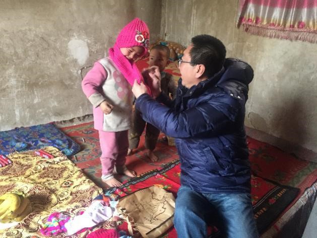 午饭后我们去了王亮老师和玛尔哈巴的亲戚家。王老师为他亲戚家的三个孩子每人准备了一套帽子、围巾、手套和袜子。当王老师亲自为衣服单薄、光着脚丫的二女儿戴上帽子和围巾的时候,小女孩那种喜悦和满足的表情让我心生酸楚,又激荡不已。