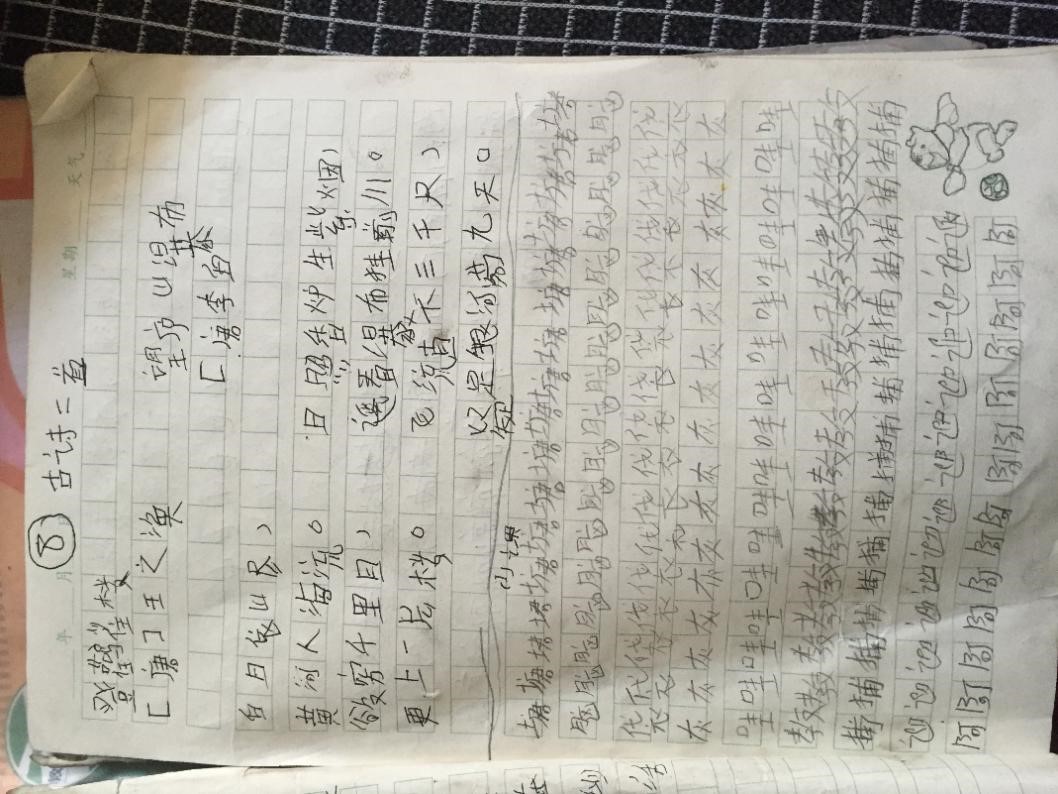 在买克苏老师亲戚家,我们看到二女儿苏比努尔·阿卜拉的作业本上用着很工整的字抄写着课文《玲玲的画》、《登鹳雀楼》和《望庐山瀑布》。