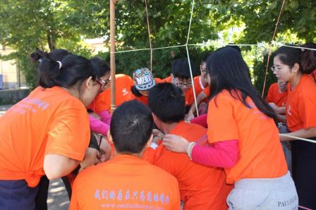 当天上午8点30时,参训人员62人精神饱满地来到位于昌平小汤山的训练场地。拓展公司的赵齐老师发表致辞,并通过一个个细微的小动作,一个个小的游戏,给同学们讲解了应该如何注意细节,如何在职场学会做人做事。随后,身着黄、蓝、橘三种颜色队服的同学组成的三个队伍,齐声高喊各自队伍口号,在热烈的气氛中拉开了本次活动的序幕。各组队员共进行了11个拓展项目,比赛过程紧张激烈,比赛项目充满趣味与挑战。比赛中,队员齐心协力,勇猛顽强,团结互助,奋勇争先。在一个同学进行项目时,其他同学一起为自己的队伍加油呐喊,欢声笑语不断,极大地增进了同学们之间的友谊与融合,进一步加深了学生对新团队的热爱,最后为全体参加训练的同学们颁奖的仪式把这次活动推向了高潮。