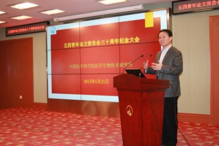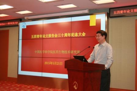 2015年5月21日,医药生物技术研究所“五四青年论文报告会”暨三十周年纪念大会成功召开。中国医学科学院北京协和医学院副院校长詹启敏院士、中国医学科学院科技管理处潘宣副处长、中国医学科学院药物研究院蒋建东院长、医药生物技术研究所甄永苏院士、邵荣光所长、李卓荣副所长、于滨书记、贾淑英副书记以及研究所各科室主任、各职能部门负责人近百人参加会议。会议由李卓荣副所长主持。
