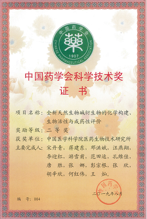 2019年9月6日,在河北石家庄举行的"2019年中国药学大会"上,我所宋丹青研究员等主持完成的"全新天然生物碱衍生物的构建和生物活性的发现"科研项目成果荣获中国药学会科学技术奖二等奖。