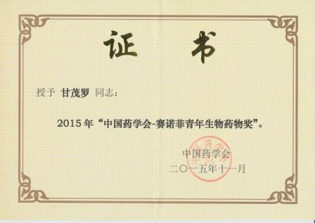 热烈祝贺我所甘茂罗副研究员荣获2015年中国药学会-赛诺菲青年生物药物奖及2015年中国药学大会暨第十五届中国药师周优秀论文评选二等奖