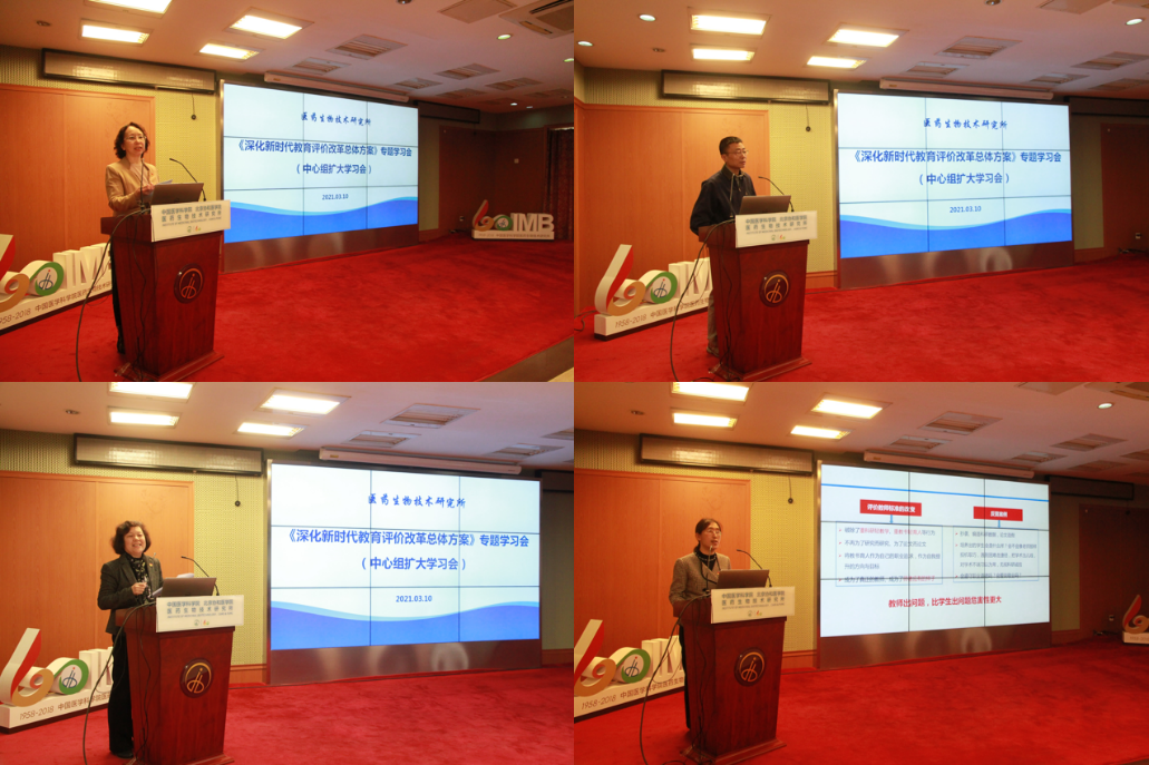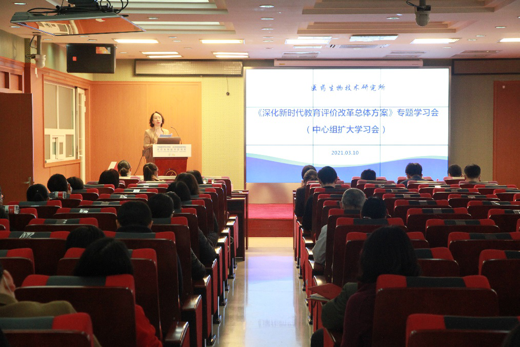 为深入学习贯彻习近平总书记关于教育的重要论述,全面落实中共中央、国务院关于《深化新时代教育评价改革总体方案》,3月10日,药生所召开《深化新时代教育评价改革总体方案》专题学习会暨党委理论中心组扩大学习会,张勤副院校长、院校党委宣传部高翠峰副部长和洪欣宜同志出席会议,所领导班子成员、党委委员、中层干部、支部正副书记、研究生导师参加会议。会议由党委书记贾淑英同志主持。