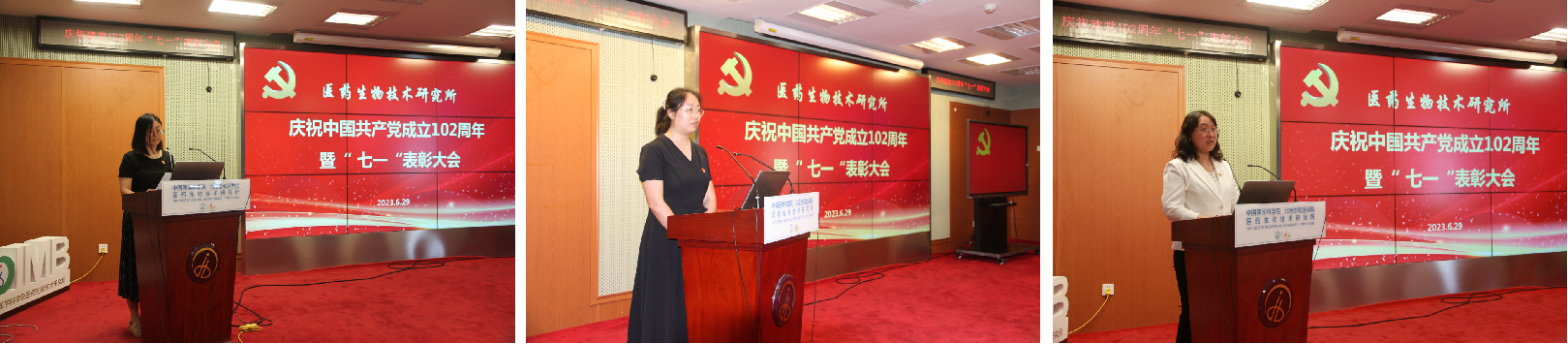 随后,先进基层党组织代表病毒-免疫支部的吴硕、优秀共产党员代表丁维明、新党员代表高瑞娟依次发言,交流了他们在干事创业和支部建设等方面的优秀经验做法,分享了入党初心,表达了为研究所党建工作和科研教育事业高质量发展、为国家医药科技事业做贡献的决心。